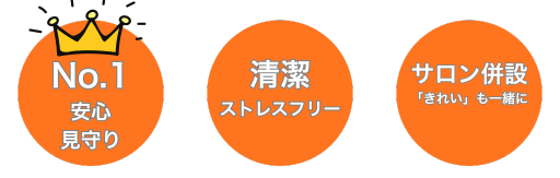 サロン併設だから、滞在中にトリミングやシャンプーも可能。お迎えのときには、ふわふわの毛並みと笑顔で再会できます。