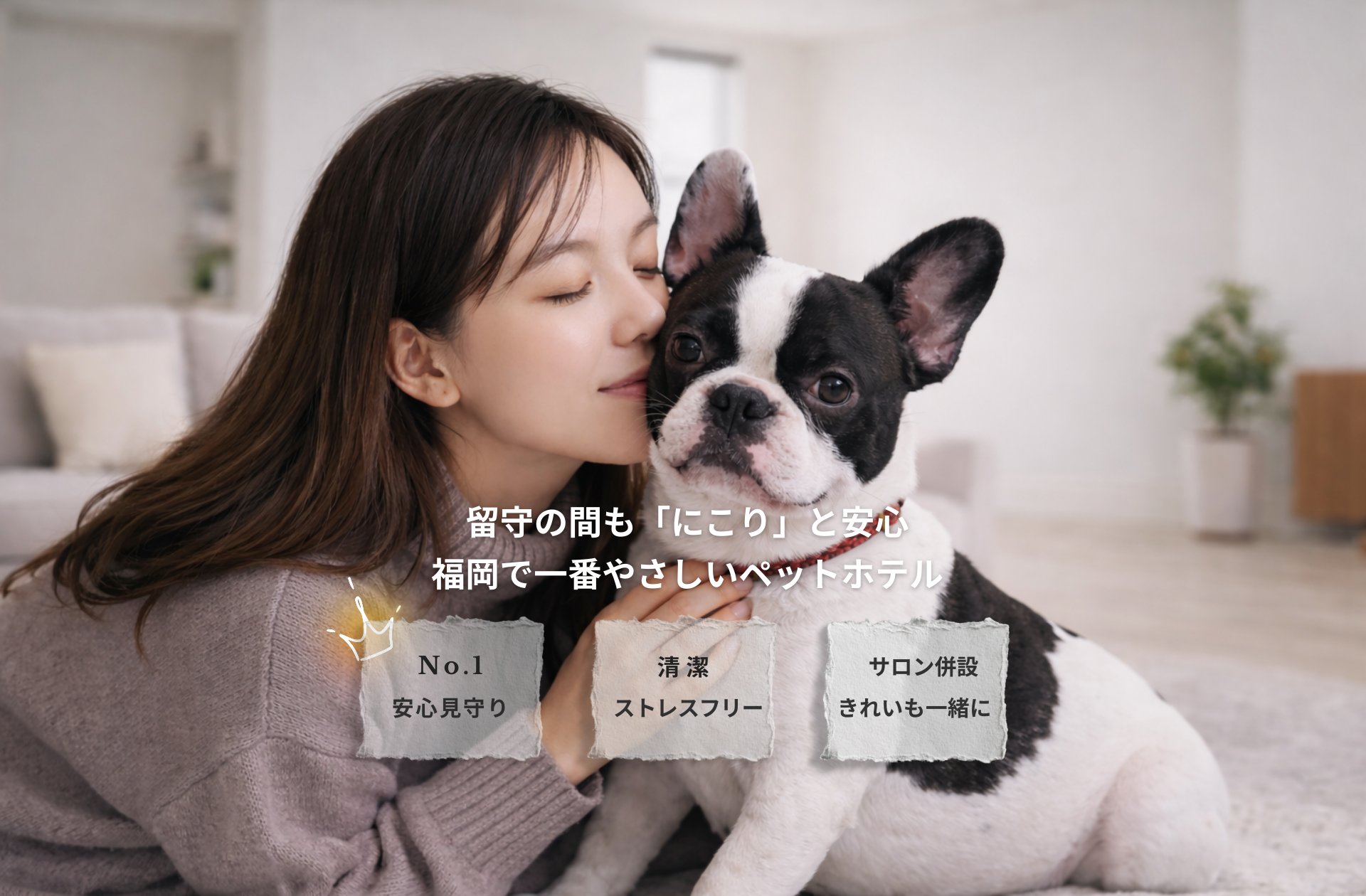 これらのお悩み、私たちにお任せください。なぜなら、私たちペットは家族だと心から思っているからです。不安な気持ちも、少しのさみしさも、きっと感じているのは飼い主さんだけではありません。Nicori(二コリ)では、どんな子にもやさしく寄り添い、安心できる環境を整えています。